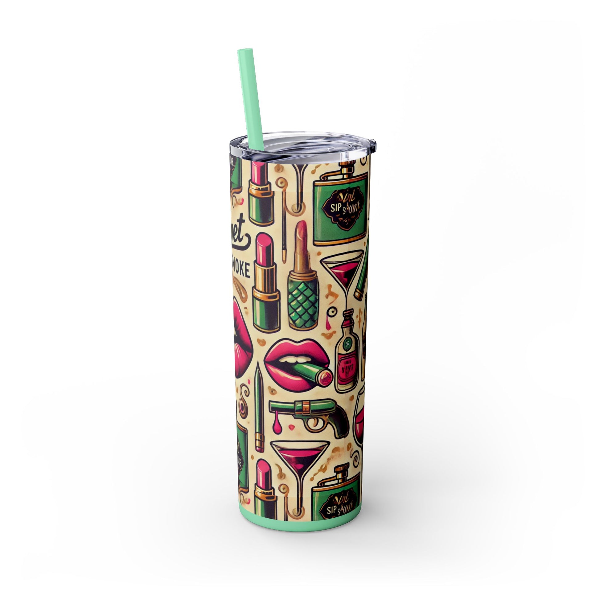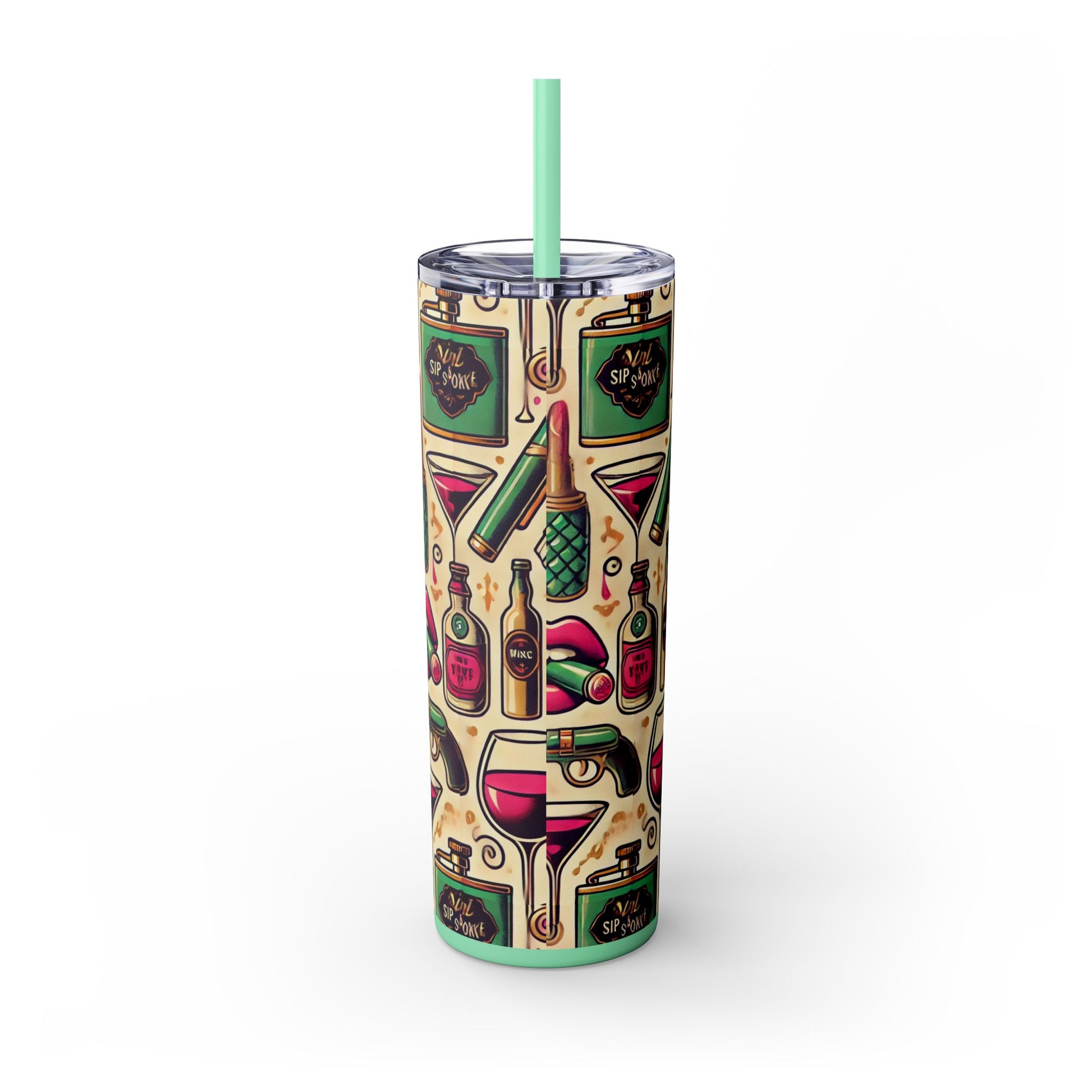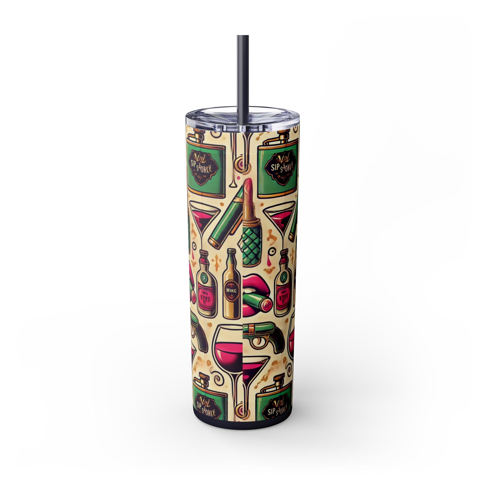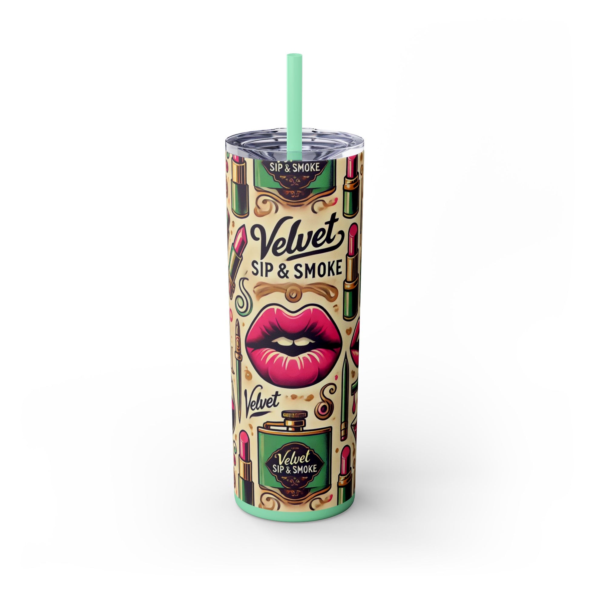 Sip in style with the Velvet Sips Skinny Tumbler, where playful design meets sophisticated functionality. Adorned with charming, whimsical icons that bring a touch of fun to your day, this sleek 20oz tumbler is as fashionable as it is practical. Perfectly tapered for an easy grip, it’s your ideal companion for morning coffee, midday smoothies, or celebratory evening cocktails.
